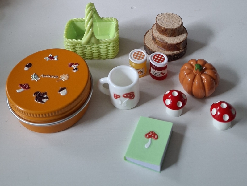 A sweet collection of items for a (Maileg) dollhouse. A basket, two mushrooms, a pumpkin (all made of resin), three real wooden tree slices, a mug, a booklet (with real pages), two jam jars, an autumn cookie tin with cookies, and plenty of fallen leaves to create a little autumnal atmosphere!