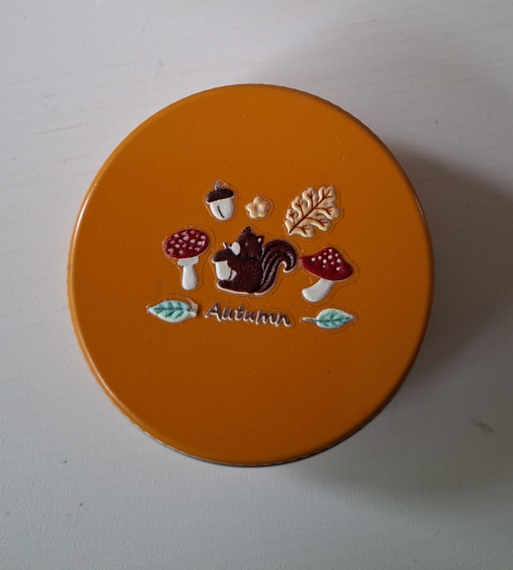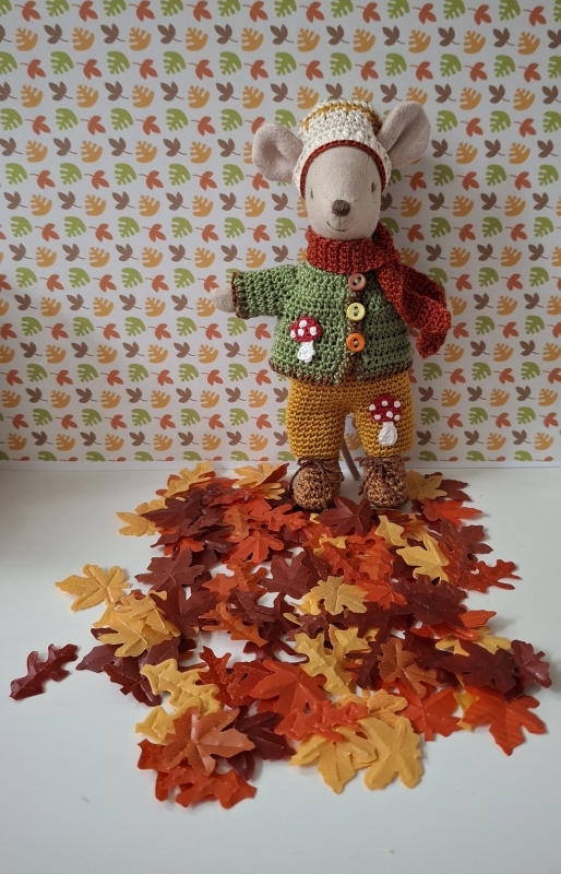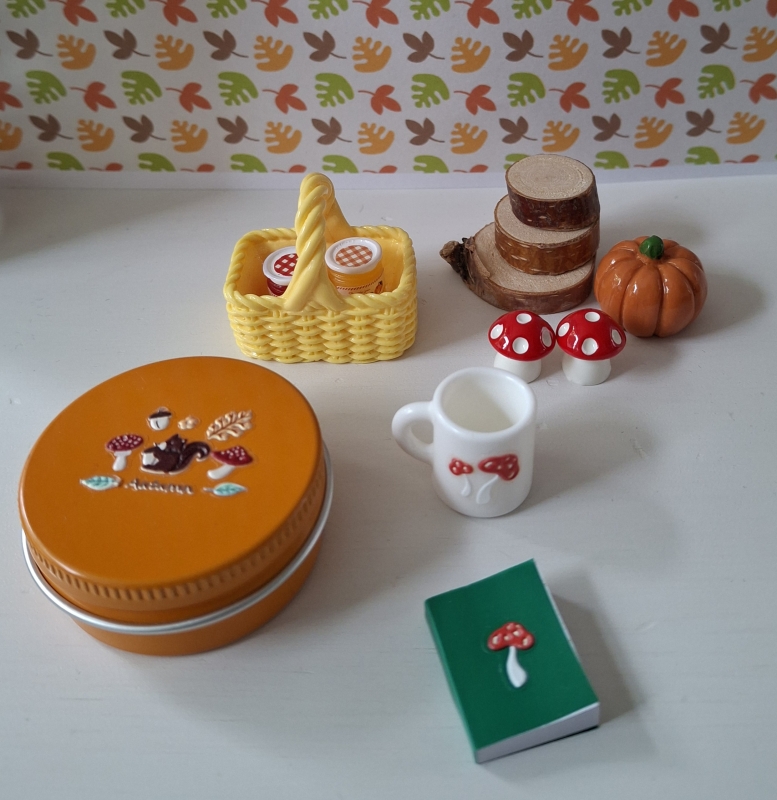 A sweet collection of items for a (Maileg) dollhouse. A basket, two mushrooms, a pumpkin (all made of resin), three real wooden tree slices, a mug, a booklet (with real pages), two jam jars, an autumn cookie tin with cookies, and plenty of fallen leaves to create a little autumnal atmosphere!